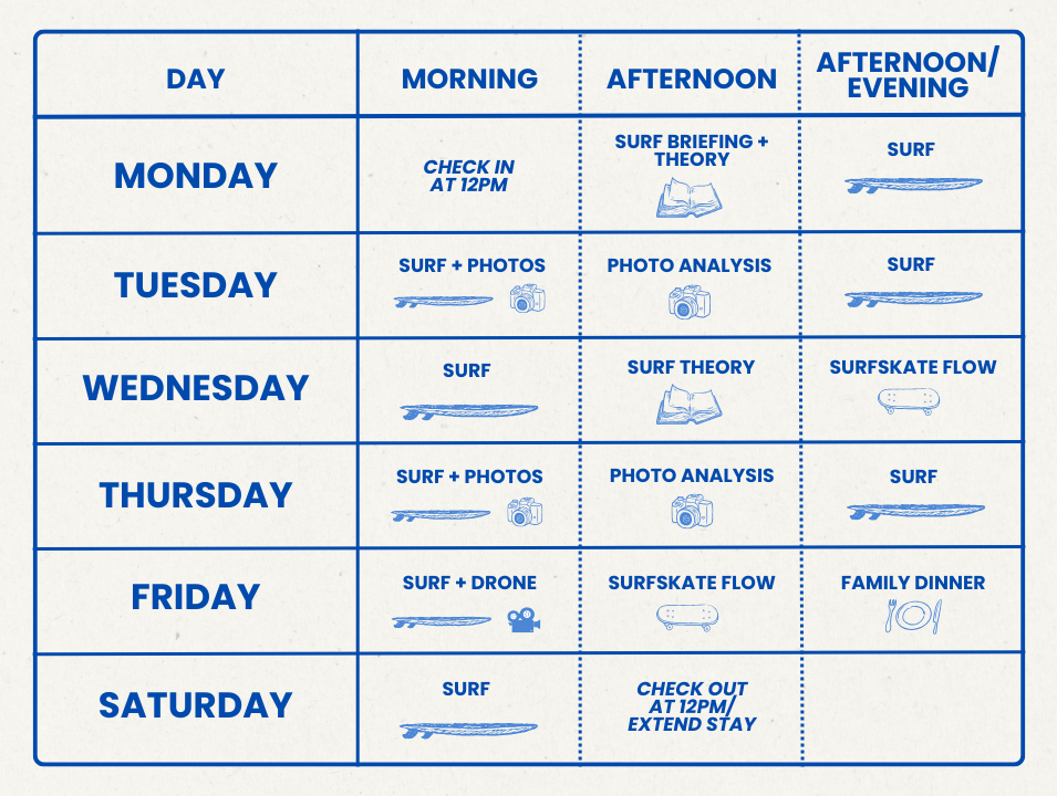Our surf camp runs from Monday to Saturday every week.